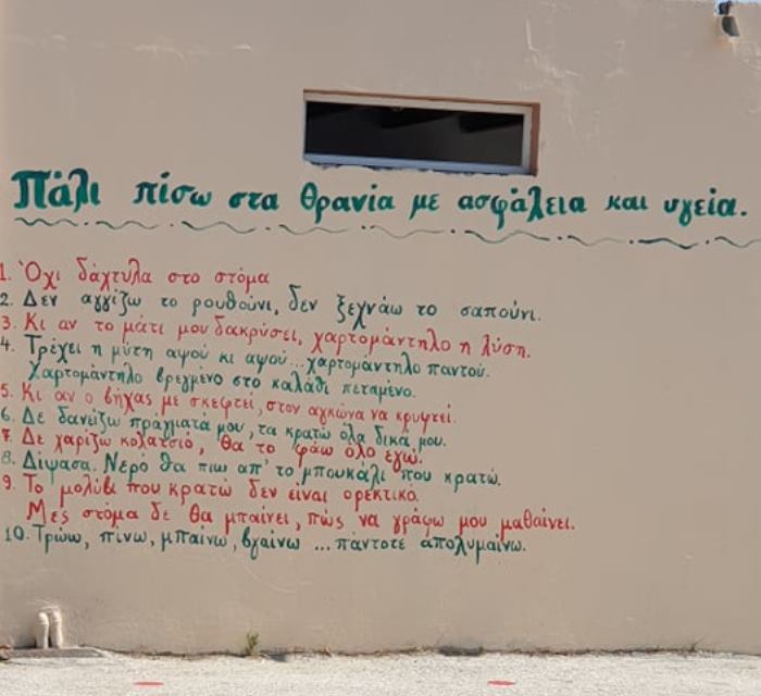 Στο 7ο Δημοτικό Σχολείο Αρτέμιδος, οι εκπαιδευτικοί προσπάθησαν να περάσουν το μήνυμα των μέτρων προστασίας που θα πρέπει να τηρούν ευλαβικά τα παιδιά, μέσα από έναν δεκάλογο με τη μορφή ποιήματος.