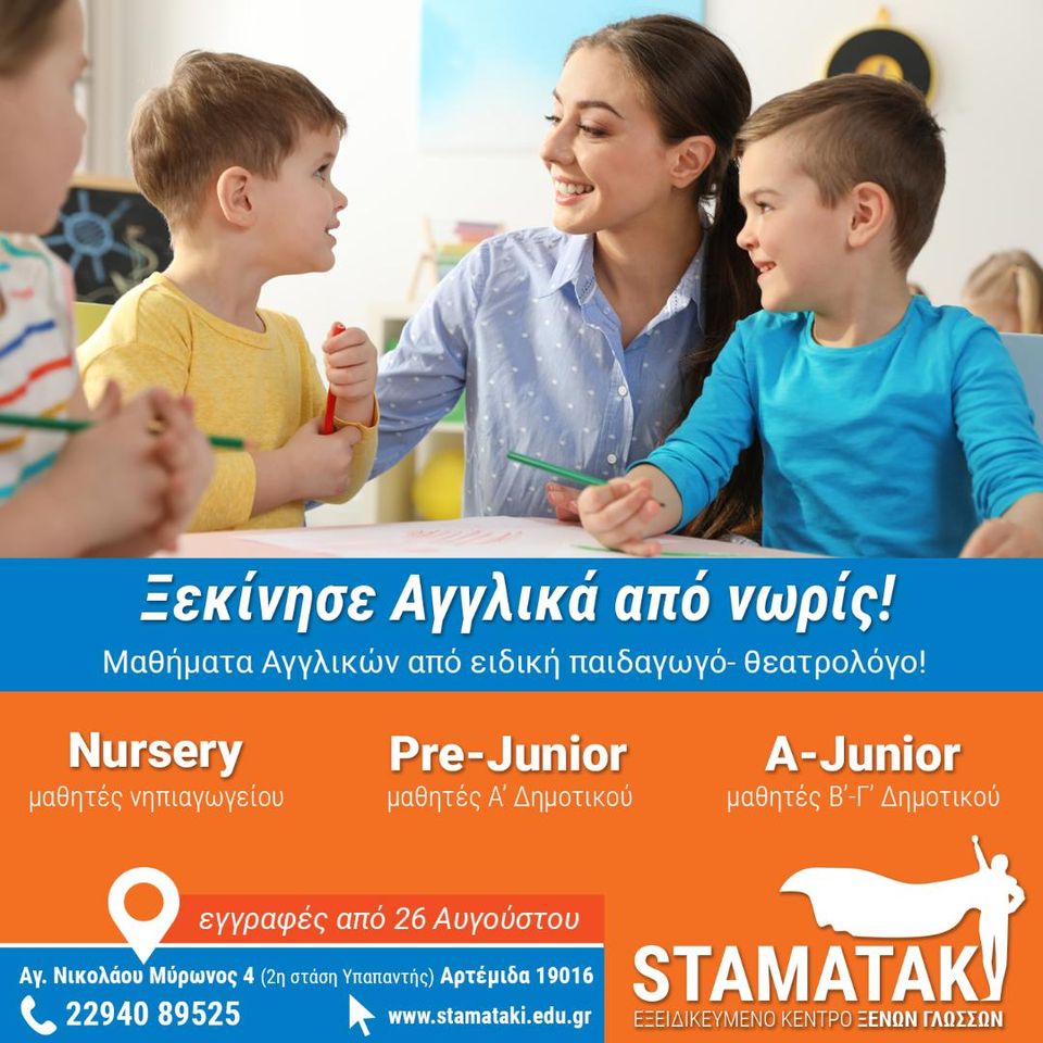 Εδώ και 25 χρόνια λειτουργεί το Κέντρο Ξένων Γλωσσών Σταματάκη στην ξενόγλωσση εκπαίδευση και τα τελευταία 15 χρόνια στην Αρτέμιδα, με αγάπη και σεβασμό στους μαθητές και μεγάλη επιτυχία στην εκμάθηση Ξένων Γλωσσών.