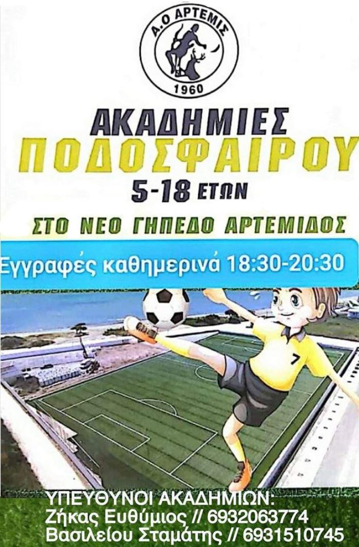 Ξεκινούν από τις 17 Αυγούστου οι εγγραφές παιδιών και εφήβων (5-18 ετών) στις Ακαδημίες Ποδοσφαίρου του Α.Ο. Άρτεμις.