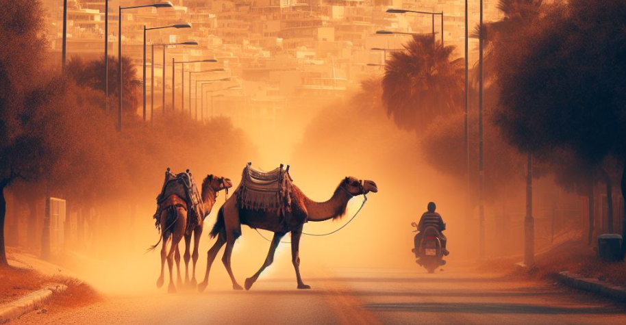 Στην εν λόγω ανάρτηση φαίνεται ο Παρθενώνας σε πορτοκαλί φόντο, ενώ στους δρόμους κυκλοφορούν καμήλες, όπως στην Αίγυπτο.
