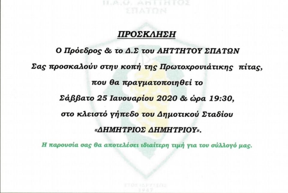 ΑΘΛΗΤΙΚΑΠΟΛΙΤΙΣΜΟΣΕΚΔΗΛΩΣΕΙΣ Αήττητος Σπάτων : Κοπή Πρωτοχρονιάτικης πίτας 2020 FacebookTwitterPinterestWhatsApp Ο πρόεδρος & το Δ.Σ του Αήττητου Σπάτων σας προσκαλούν στην κοπή της Πρωτοχρονιάτικης πίτας που θα πραγματοποιηθεί το Σάββατο 25 Ιανουαρίου 2020 & ώρα 19:30 στο κλειστό γήπεδο του Δημοτικού Σταδίου