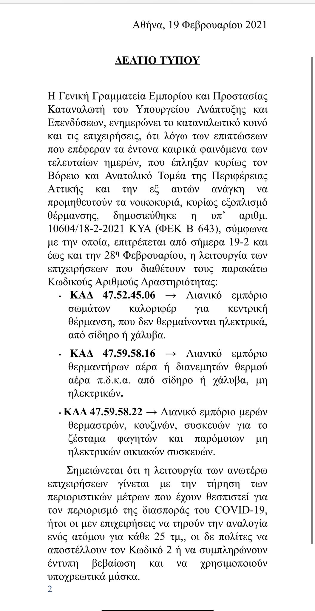 Από σήμερα και έως τις 28/2 επιτρέπεται η λειτουργία, στον Βόρειο και Ανατολικό τομέα της Περιφέρειας Αττικής, καταστημάτων που πωλούν συσκευές θέρμανσης μη ηλεκτρικές καθώς και το λιανικό εμπόριο σιδηρικών, χρωμάτων, τζαμιών κλπ.