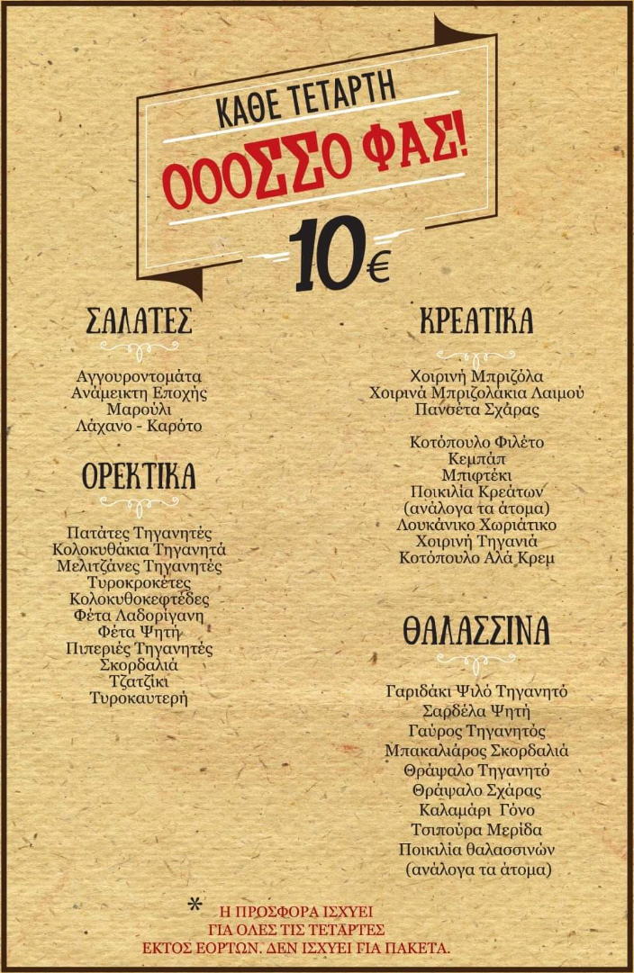 Απολαύστε το φαγητό σας μόνο με 10 ευρώ το άτομο κάθε Τετάρτη, ενώ κάθε Παρασκευή μπορείτε να φάτε και να πιείτε όσο θέλετε μόνο με 15 ευρώ το άτομο.