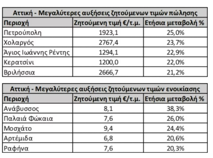Οι περιοχές με τις μεγαλύτερες αυξήσεις στα ενοίκια και την πώληση