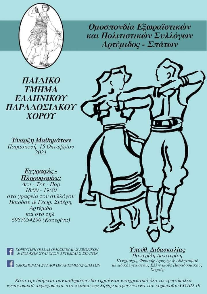 Η Ομοσπονδία Εξωραϊστικών και Πολιτιστικών Συλλόγων Αρτέμιδος – Σπάτων ενημερώνει ότι τα μαθήματα παραδοσιακών χορών για παιδιά ξεκίνησαν.