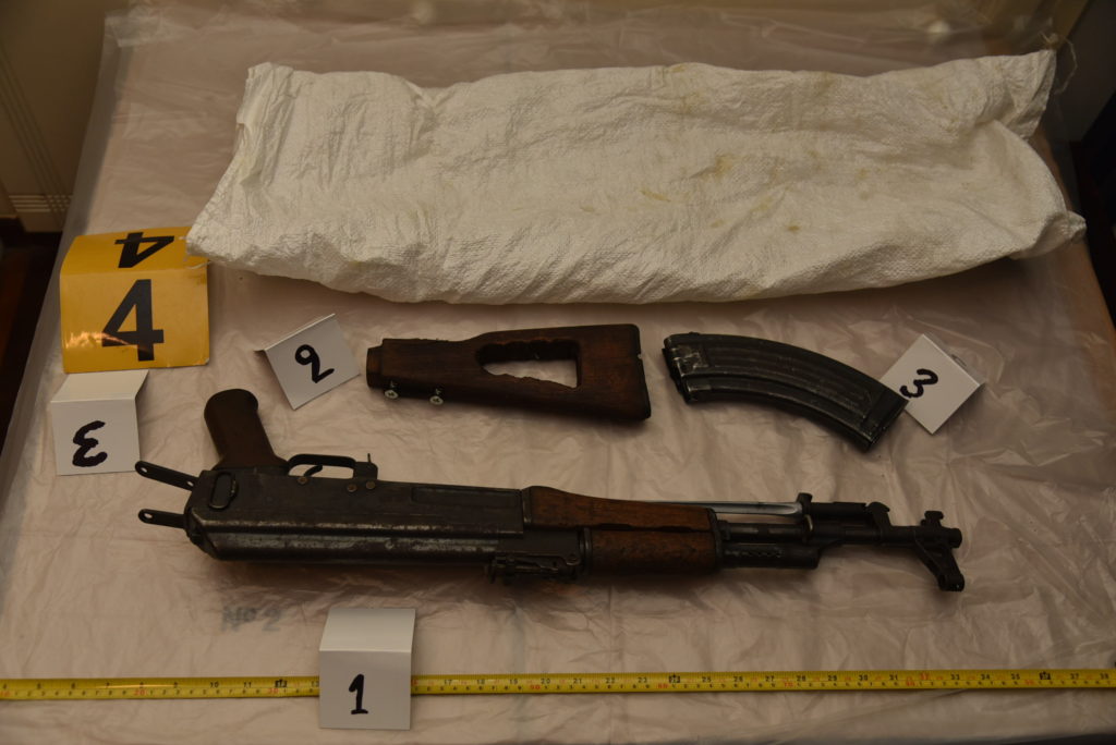 Πέντε πολεμικά τυφέκια τύπου καλάσνικοφ, ένα εκ των οποίων έφερε γεμιστήρα με είκοσι οκτώ φυσίγγια, ένα υποπολυβόλο, δύο πυροβόλα πιστόλια (το ένα έφερε γεμιστήρα επτά φυσιγγίων και ένα φυσίγγιο στη θαλάμη), επτά γεμιστήρες πολεμικού τυφεκίου, εκ των οποίων η μία έφερε είκοσι οκτώ φυσίγγια, δεκαοκτώ φυσίγγια πυροβόλου όπλου 7.62mm, πενήντα τρία (53) φυσίγγια διαφόρων διαμετρημάτων και εκατόν εννέα κυνηγετικά φυσίγγια.
