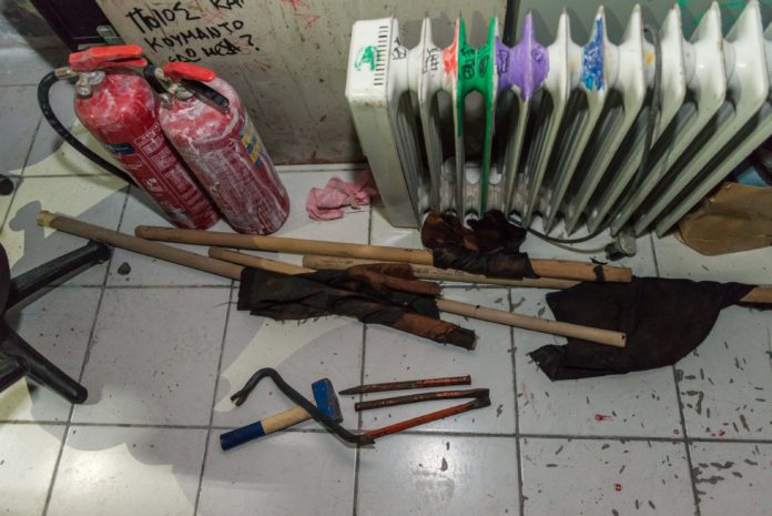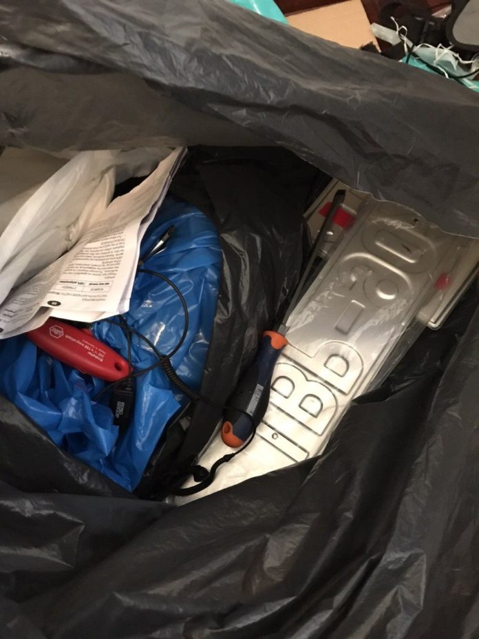 Δύο αλεξίσφαιρα γιλέκα, πλήθος πλαστών πινακίδων κυκλοφορίας οχημάτων (4 αυτοκινήτων και 1 μοτοσικλέτας), κινητό, φορητός υπολογιστής, κάμερες καταγραφής κλειστού κυκλώματος τηλεόρασης (CCTV), εκτυπωτής και πλαστικοποιητής, κράνος μοτοσικλέτας, πλήθος εργαλείων, συσκευή ηλεκτρικής κένωσης (TAZER), μεταλλική σιδερογροθιά, πιεστικό μηχάνημα πλύσης –απολύμανσης χώρου, μπουκάλι χλωρίνης, ποσότητες ναρκωτικών ουσιών, ακατέργαστης ινδικής κάνναβης και κοκαΐνης.