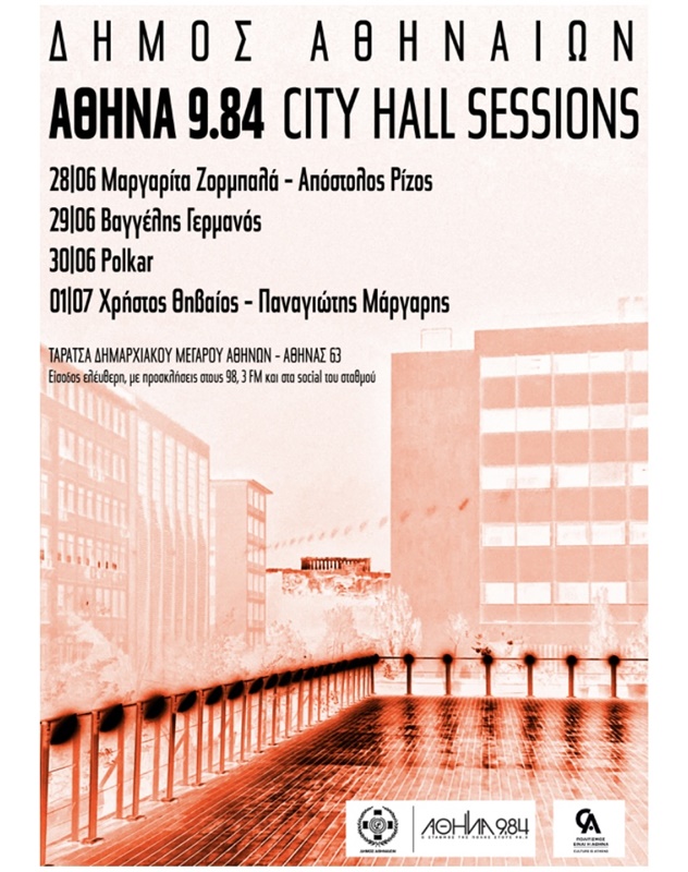 Ο Αθήνα 9,84, ετοίμασε και παρουσιάζει μια σειρά ραδιοφωνικών συναυλιών σε ένα απρόσμενο και πανέμορφο σημείο της πόλης.Το Δημαρχιακό Μέγαρο της Αθήνας ανοίγει τις πόρτες του και μας καλεί να περάσουμε δροσερές μουσικές βραδιές στην φιλόξενη ταράτσα του με θέα την Ακρόπολη και τον Λυκαβηττό.Οι συναυλίες είναι ανοιχτές για το κοινό. Όσοι το επιθυμούν, μπορούν να τις παρακολουθήσουν ζωντανά, με ελεύθερη είσοδο. Αρκεί να συντονιστούν στους 98, 3 FM και στα social media του σταθμού για να κερδίσουν προσκλήσεις.