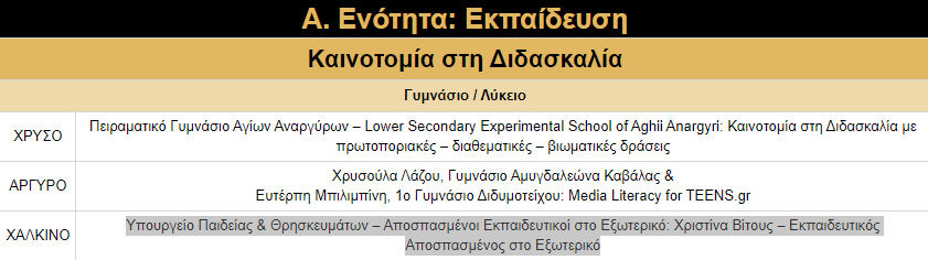 Αξίζει να σημειωθεί ότι για πρώτη φορά καθιερώθηκαν και απονεμήθηκαν φέτος ειδικά βραβεία για τους διακεκριμένους εκπαιδευτικούς οργανισμούς, καθώς και για τον εκπαιδευτικό της χρονιάς.
