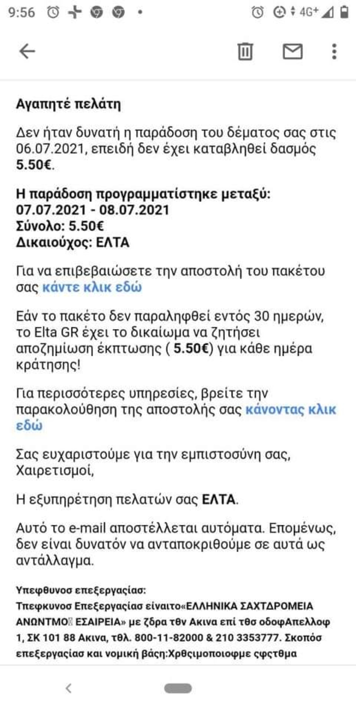 Με αφορμή τη διακίνηση παρόμοιων sms σε αδιευκρίνιστο αριθμό χρηστών του διαδικτύου, τα Ελληνικά Ταχυδρομεία ενημερώνουν ότι δεν αποστέλλουν μηνύματα ηλεκτρονικού ταχυδρομείου (e-mail) ή μηνύματα κινητής τηλεφωνίας (sms) στους πελάτες τους, μέσω των οποίων ζητούν στοιχεία τραπεζικού λογαριασμού ή πιστωτικής κάρτας, με σκοπό την παράδοση κάποιου δέματος.