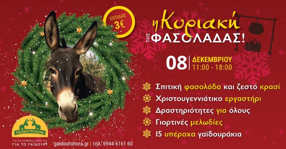 Στη Γαϊδουροχώρα, το Ελληνικό Κέντρο για το γαϊδούρι στο Κορωπί, την Κυριακή 8 Δεκεμβρίου 2019 καλωσορίζουμε τα Χριστούγεννα με παραδοσιακή φασολάδα και μυρωδάτο ζεστό κρασί!