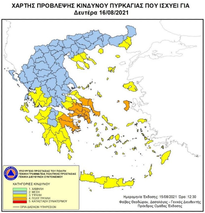 Σύμφωνα με τον Χάρτη Πρόβλεψης Κινδύνου Πυρκαγιάς που εκδίδει η Γενική Γραμματεία Πολιτικής Προστασίας του Υπουργείου Προστασίας του Πολίτη, για την Δευτέρα 16 Αυγούστου 2021, προβλέπεται πολύ υψηλός κίνδυνος πυρκαγιάς (Κατηγορία κινδύνου 4) για τις εξής περιοχές: