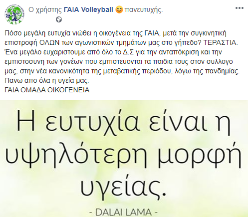 “Πάνω από όλα η υγεία μας. ΓΑΙΑ ΟΜΑΔΑ ΟΙΚΟΓΕΝΕΙΑ” αναφέρεται στην ανάρτηση, η οποία συνοδεύεται και από ένα απόφθεγμα του Δαλάι Λάμα, σύμφωνα με το οποίο “Η ευτυχία είναι η υψηλότερη μορφή υγείας”.