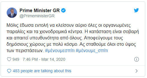 ΤΟΠΙΚΑ ΝΕΑΑΡΤΕΜΙΔΑΕΙΔΗΣΕΙΣ Κλείνουν οργανωμένες παραλίες και χιονοδρομικά κέντρα FacebookTwitterPinterestWhatsApp Με ανάρτηση του στο twitter ο πρωθυπουργός ανακοίνωσε ότι κλείνουν οργανωμένες παραλίες και χιονοδρομικά κέντρα.
