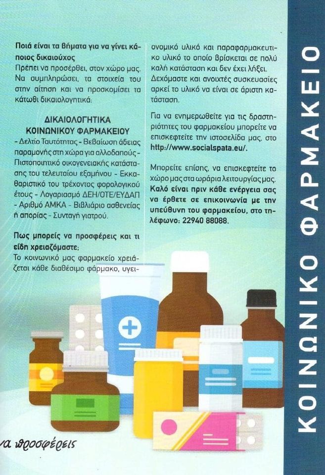 Για να ενημερωθείτε για τις δραστηριότητες του φαρμακείου µμπορείτε να επισκεφτείτε την ιστοσελίδα µας στο http://www.socialspata.eu .