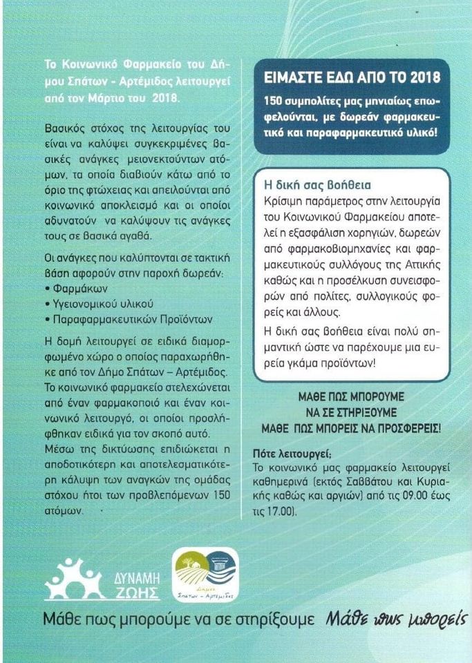 Το κοινωνικό Φαρμακείο του Δήμου Σπάτων – Αρτέμιδος λειτουργεί από τον Μάρτιο του 2018