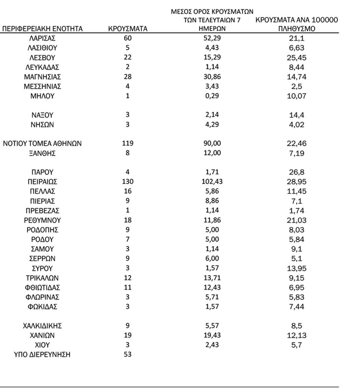 Με βάση τα επιβεβαιωμένα κρούσματα των τελευταίων 7 ημερών, 28 θεωρούνται σχετιζόμενα με ταξίδι από το εξωτερικό και 2.157 είναι σχετιζόμενα με ήδη γνωστό κρούσμα.