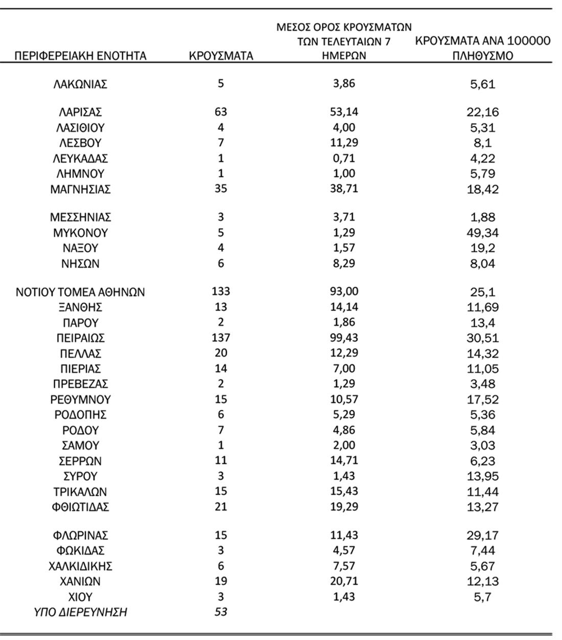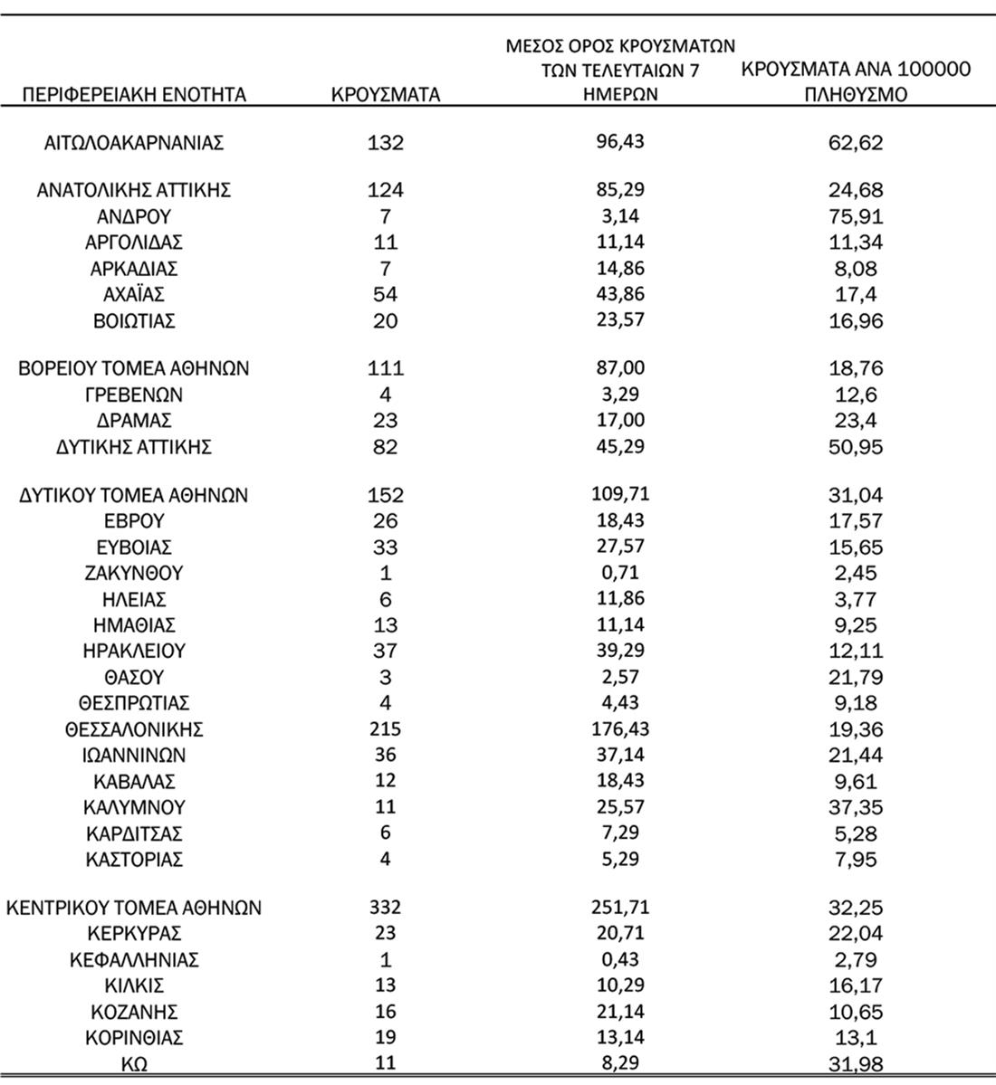 Η κατανομή των 2.182 νέων εγχώριων κρουσμάτων ανά Περιφερειακή Ενότητα παρουσιάζεται στον κατωτέρω πίνακα: