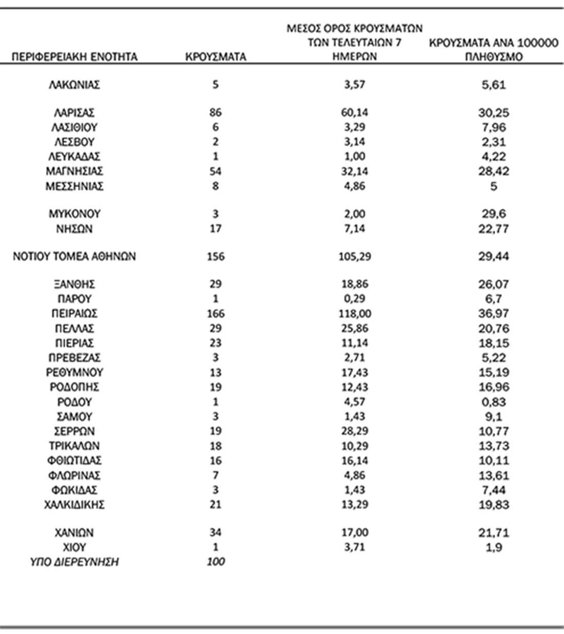 Με βάση τα επιβεβαιωμένα κρούσματα των τελευταίων 7 ημερών, 55 θεωρούνται σχετιζόμενα με ταξίδι από το εξωτερικό και 2.872 είναι σχετιζόμενα με ήδη γνωστό κρούσμα.
