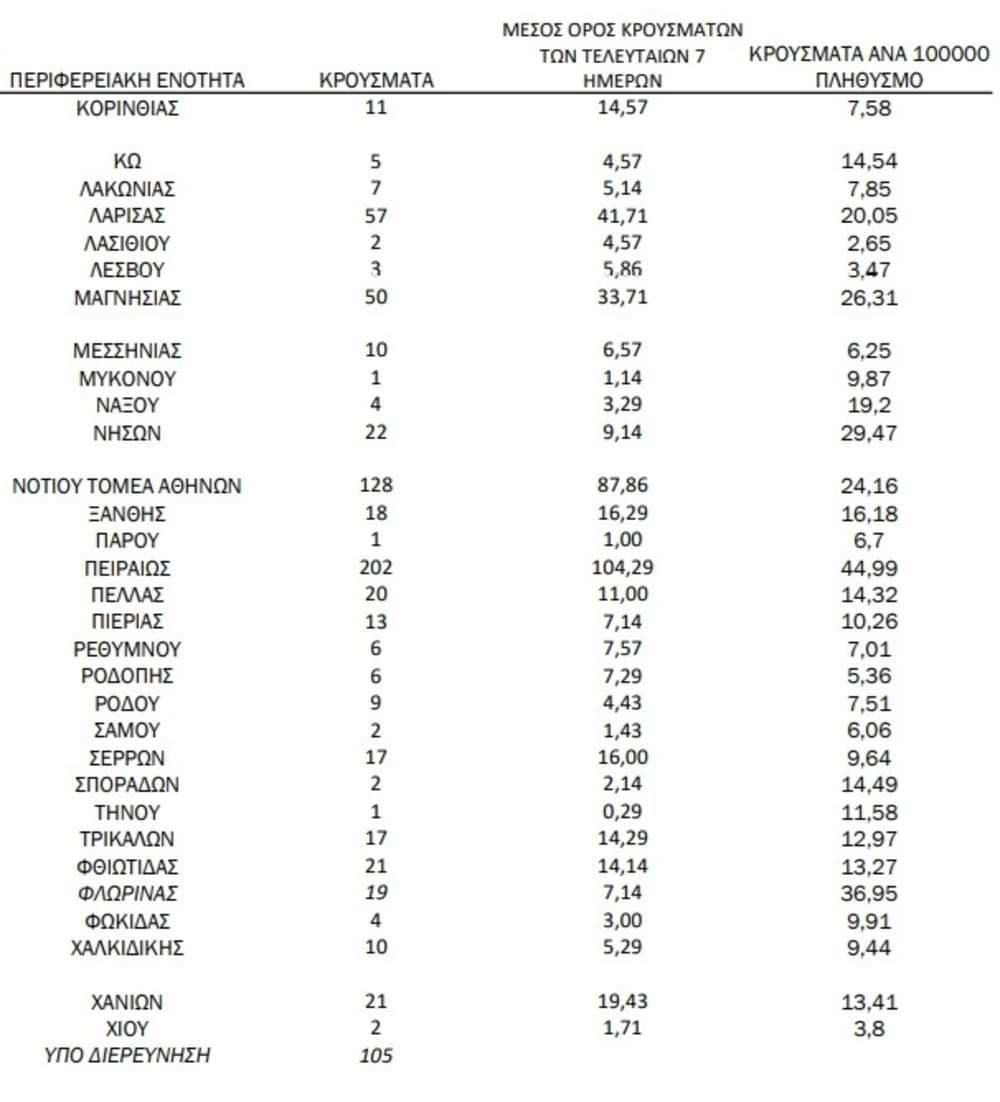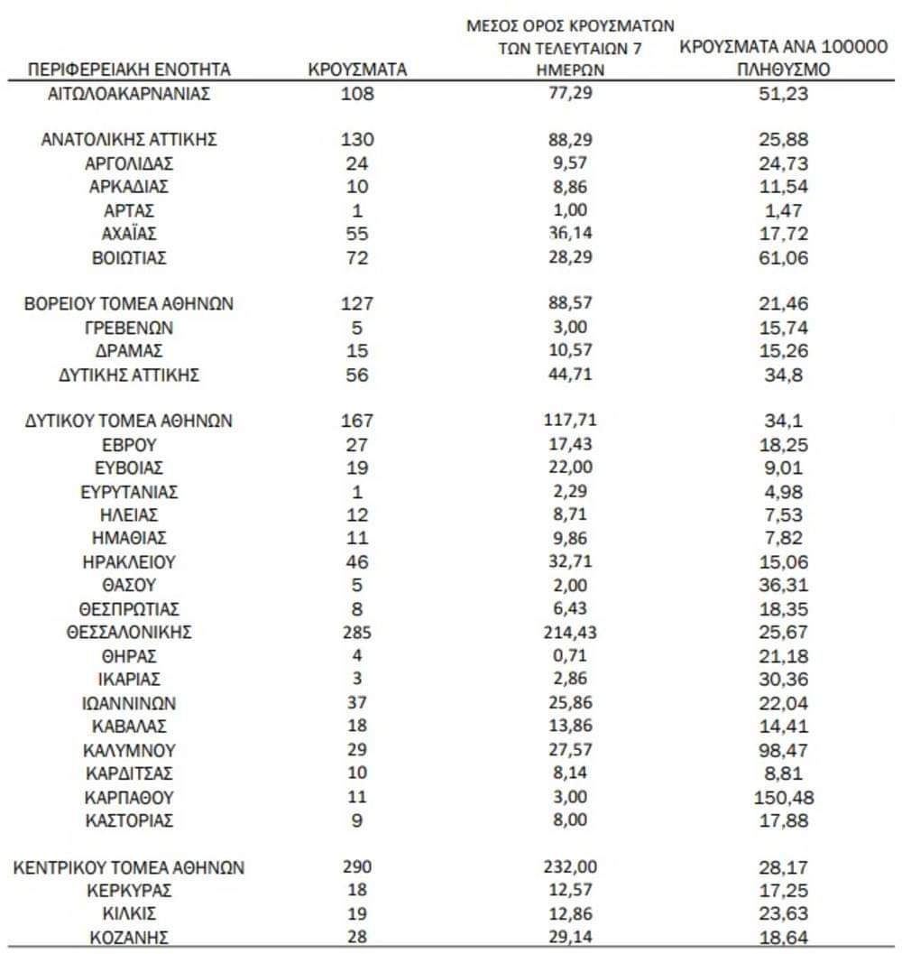 Η κατανομή των 2.456 νέων εγχώριων κρουσμάτων ανά Περιφερειακή Ενότητα παρουσιάζεται στον κατωτέρω πίνακα: