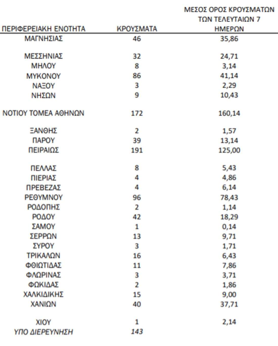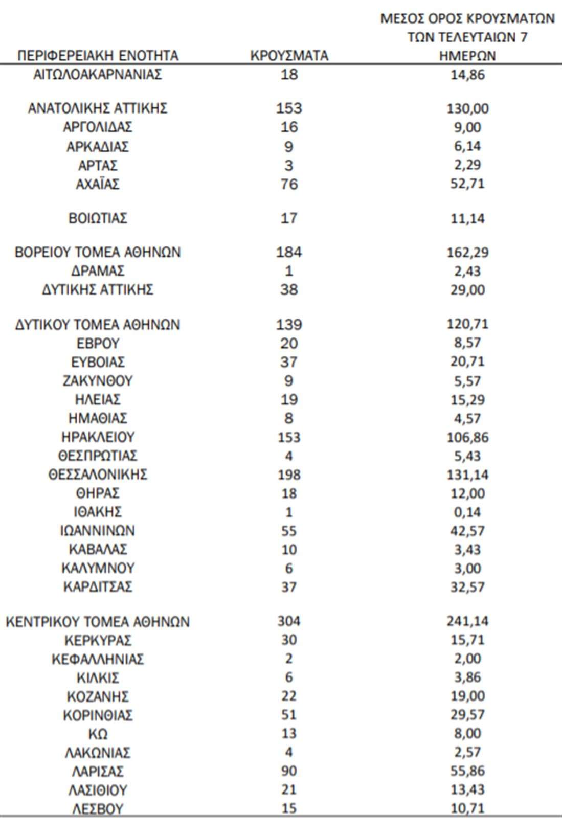 Η κατανομή των 2.779 νέων εγχώριων κρουσμάτων ανά Περιφερειακή Ενότητα παρουσιάζεται στον κατωτέρω πίνακα: