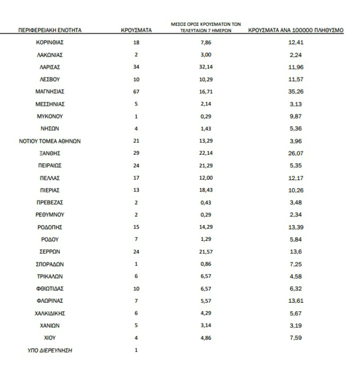 - Μαγνησία: 35,26 κρούσματα / 100.000 κατοίκους