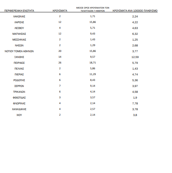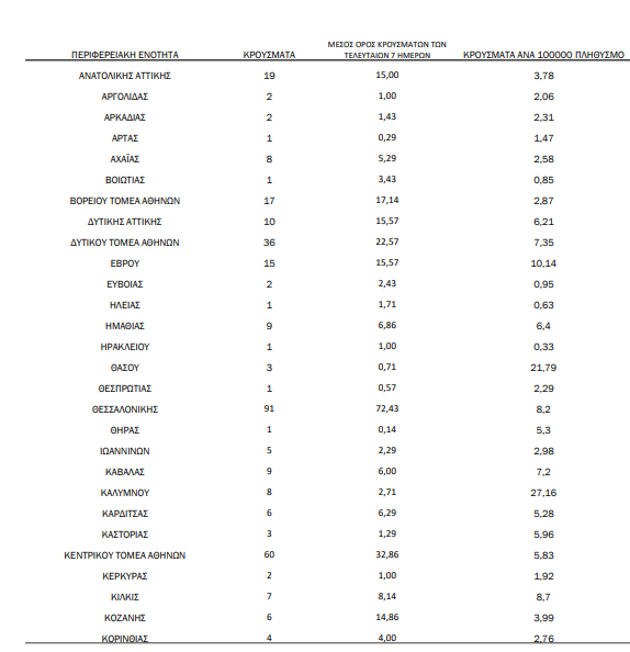 Η κατανομή των 464 νέων εγχώριων κρουσμάτων ανά Περιφερειακή Ενότητα παρουσιάζεται στον κατωτέρω πίνακα: