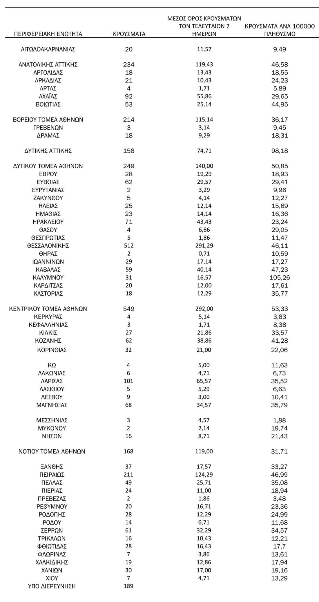 Με βάση τα επιβεβαιωμένα κρούσματα των τελευταίων 7 ημερών, 50 θεωρούνται σχετιζόμενα με ταξίδι από το εξωτερικό και 2.960 είναι σχετιζόμενα με ήδη γνωστό κρούσμα.