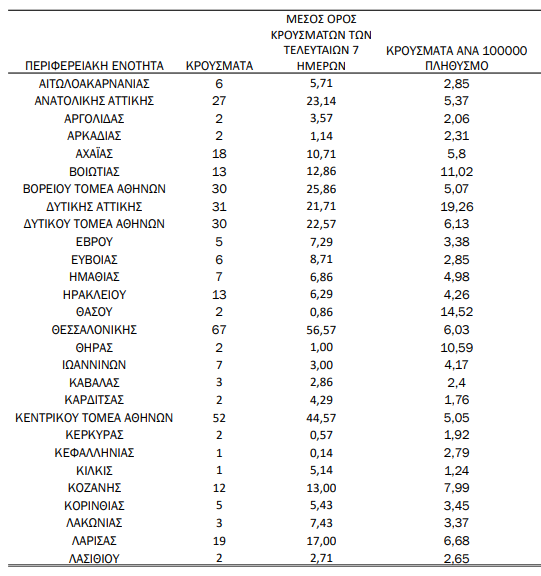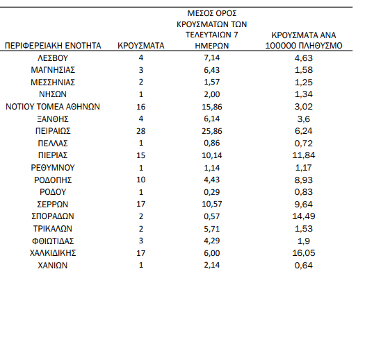 Η κατανομή των 498 νέων εγχώριων κρουσμάτων ανά Περιφερειακή Ενότητα παρουσιάζεται στον παρακάτω πίνακα: