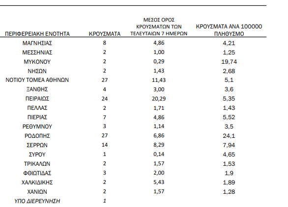 Η κατανομή των 497 νέων εγχώριων κρουσμάτων ανά Περιφερειακή Ενότητα παρουσιάζεται στον κατωτέρω πίνακα.