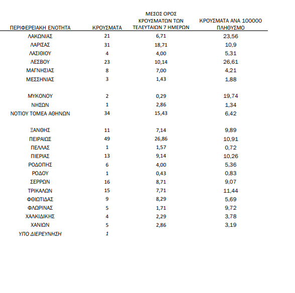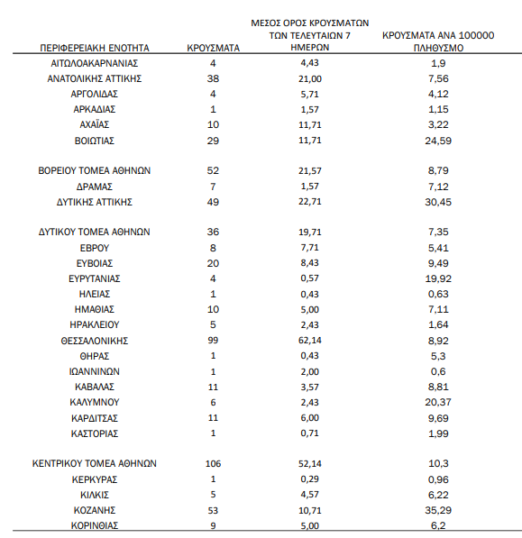 Η κατανομή των 845 νέων εγχώριων κρουσμάτων ανά Περιφερειακή Ενότητα παρουσιάζεται στον κατωτέρω πίνακα.