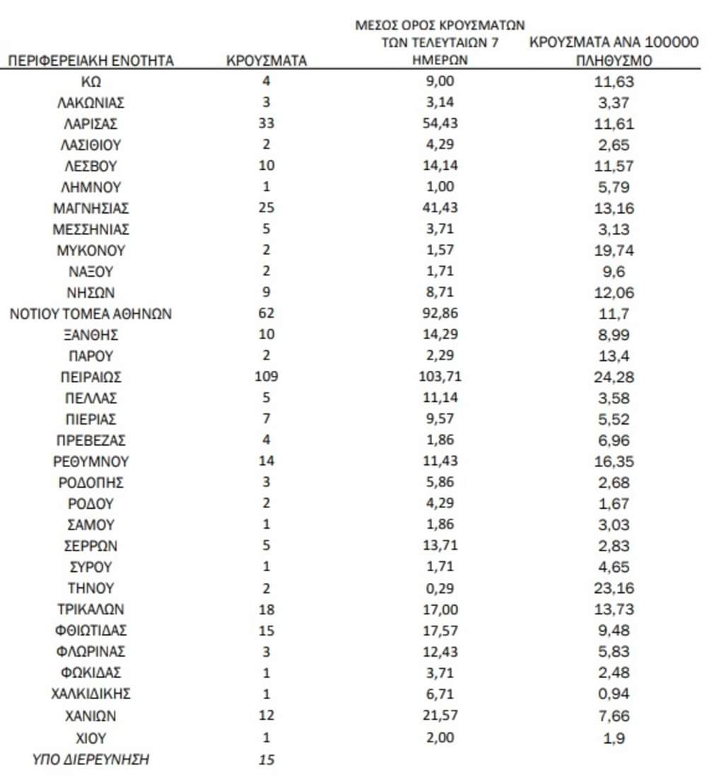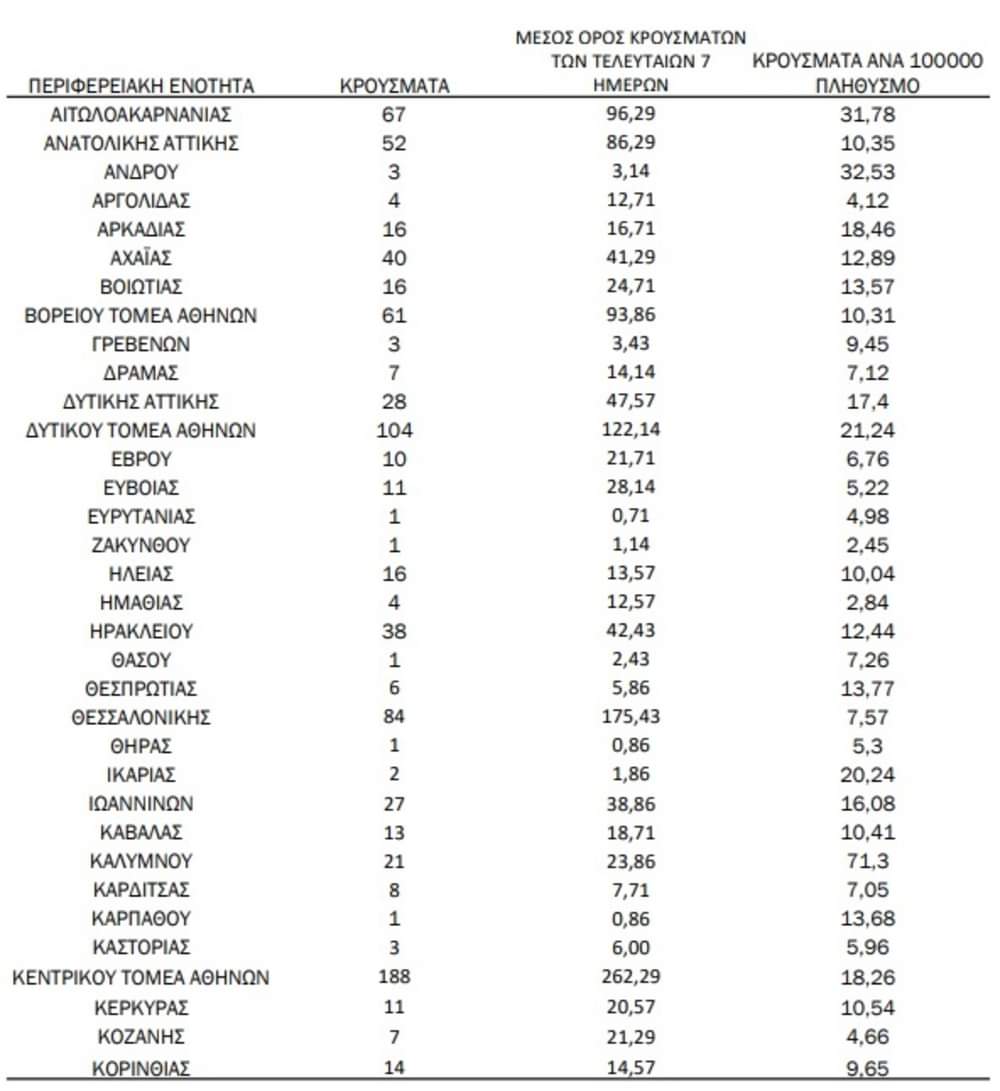 Με βάση τα επιβεβαιωμένα κρούσματα των τελευταίων 7 ημερών, 40 θεωρούνται σχετιζόμενα με ταξίδι από το εξωτερικό και 2.711 είναι σχετιζόμενα με ήδη γνωστό κρούσμα.