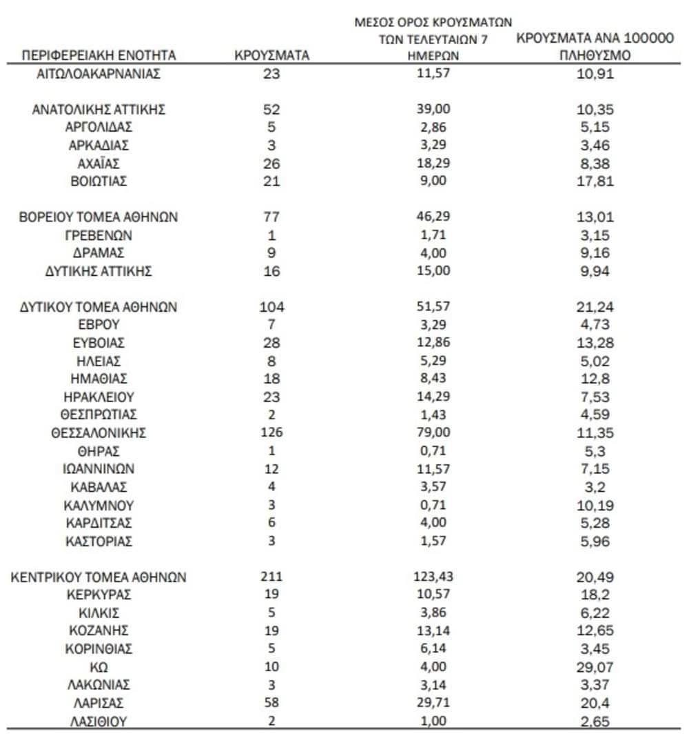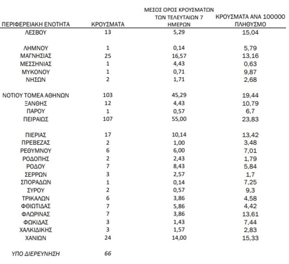 Η κατανομή των 1.332 νέων εγχώριων κρουσμάτων ανά Περιφερειακή Ενότητα παρουσιάζεται στον κατωτέρω πίνακα.