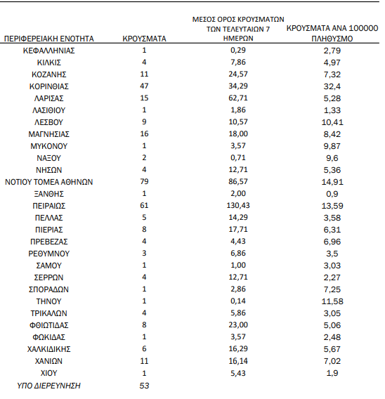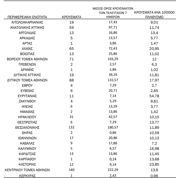 Η κατανομή των 1.121 νέων εγχώριων κρουσμάτων ανά Περιφερειακή Ενότητα παρουσιάζεται στον κατωτέρω πίνακα: