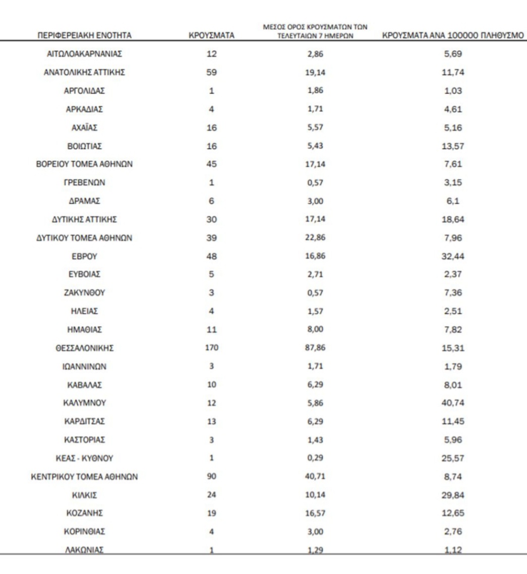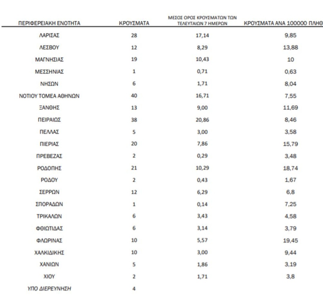 Δείτε τη λίστα με τα νέα εγχώρια κρούσματα ανά περιφερειακή ενότητα: