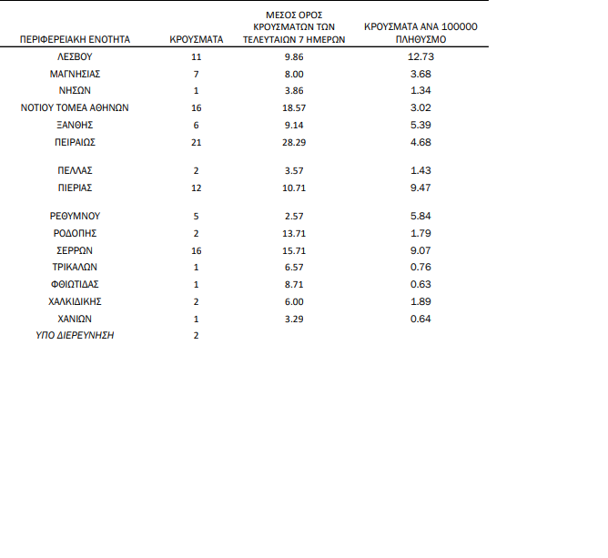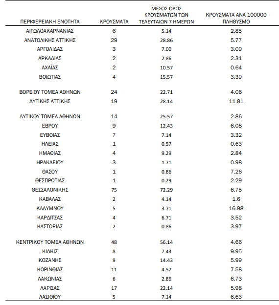 Η κατανομή των 427 νέων εγχώριων κρουσμάτων ανά Περιφερειακή Ενότητα παρουσιάζεται στον κατωτέρω πίνακα: