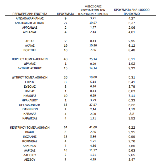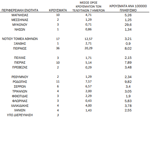 Η κατανομή των 503 νέων εγχώριων κρουσμάτων ανά Περιφερειακή Ενότητα παρουσιάζεται στον κατωτέρω πίνακα: