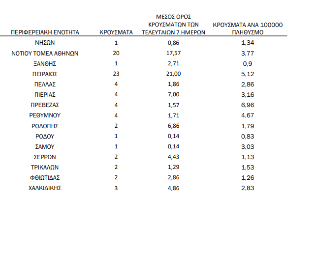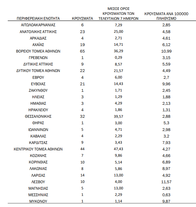 Η κατανομή των 410 νέων εγχώριων κρουσμάτων ανά Περιφερειακή Ενότητα παρουσιάζεται στον παρακάτω πίνακα: