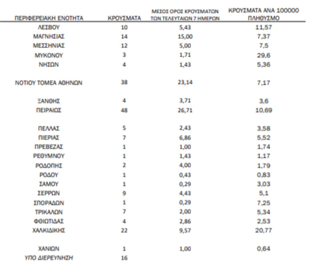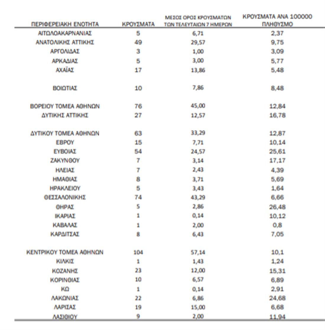 Η κατανομή των 840 νέων εγχώριων κρουσμάτων ανά Περιφερειακή Ενότητα παρουσιάζεται στον παρακάτω πίνακα: