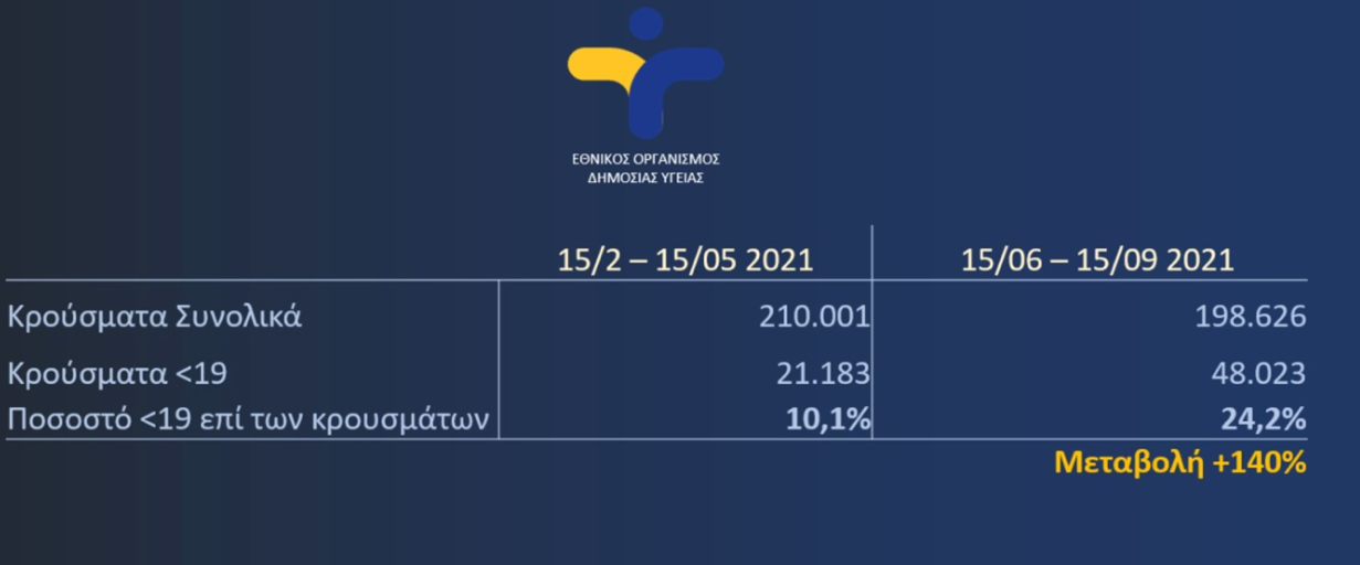 Σύμφωνα με την ενημέρωση από το Υπουργείο Παιδείας, είναι χαρακτηριστικό ότι μεταξύ 15/6/2021 και 15/9/2021, δηλαδή τους καλοκαιρινούς μήνες, όταν τα σχολεία ήταν κλειστά, ο αριθμός κρουσμάτων σε νέους κάτω των 19 ετών αυξήθηκε από 238 κρούσματα την ημέρα κατά μέσο όρο (15/2/21-15/5/21) σε 522 κρούσματα την ημέρα κατά μέσο όρο (15/6/21-15/9/21), δηλαδή υπερδιπλασιάστηκε. Αντίστοιχα, το ποσοστό των συνολικών κρουσμάτων COVID-19 που αντιστοιχούσε σε νέους κάτω των 19 ετών αυξήθηκε από 10.1% (15/02/21-15/5/21) σε 24.2% (15/06/21-15/9/21) (βλ. τον παρακάτω πίνακα).