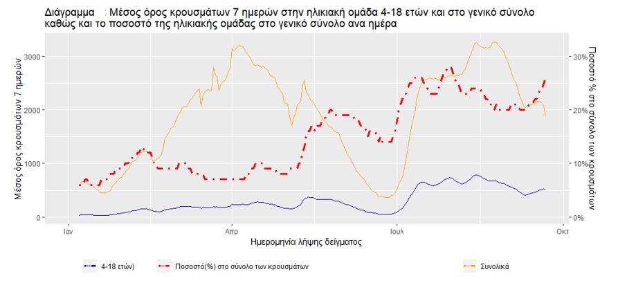 Το παρακάτω γράφημα αποτυπώνει την εξέλιξη των κρουσμάτων σε παιδιά ηλικίας 4-18 ετών και στον γενικό πληθυσμό από τον Ιανουάριο του 2021 έως σήμερα, και δείχνει ότι ο μέσος όρος κρουσμάτων σε νέους ηλικίας 4-18 ετών ήταν υψηλότερος στις αρχές Αυγούστου από ό,τι σήμερα.