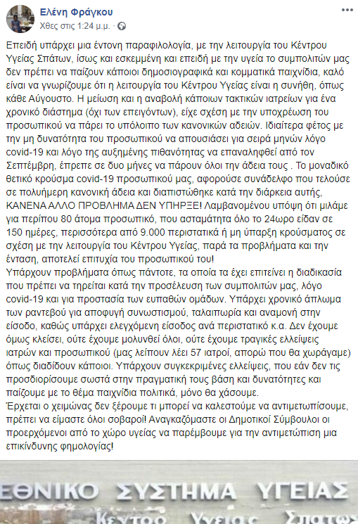 Επειδή υπάρχει μια έντονη παραφιλολογία, με την λειτουργία του Κέντρου Υγείας Σπάτων, η Δημοτική Σύμβουλος της ΑΝ.Α.Σ.Σ.Α Ελένη Φράγκου, η οποία προέρχεται από τον χώρο υγείας, θέλησε να παρέμβει για την αντιμετώπιση αυτής της επικίνδυνης, όπως τη χαρακτηρίζει, φημολογίας!