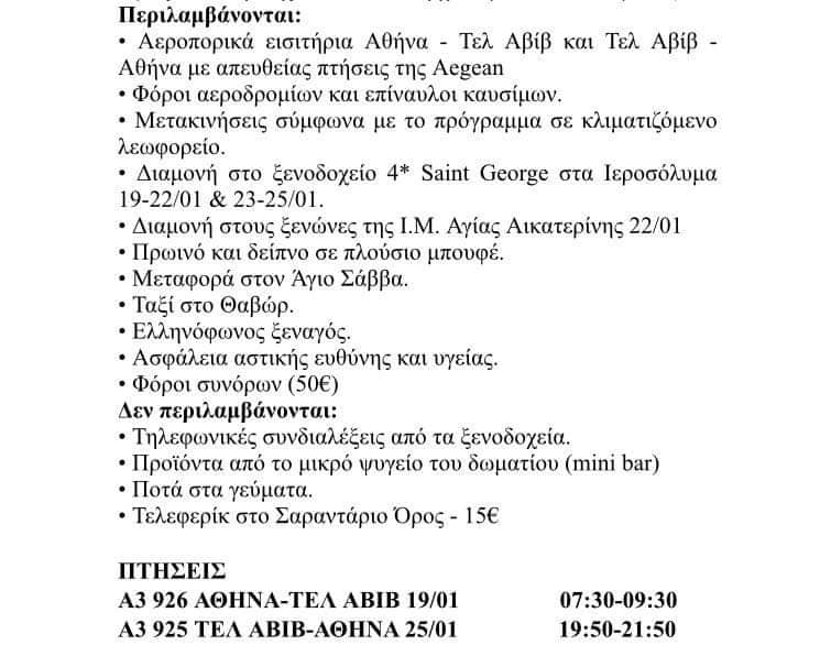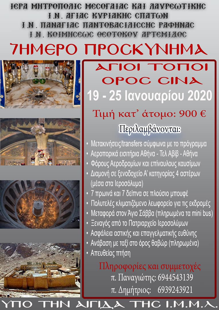 Επταήμερο προσκήνυμα στους Αγίους Τόπους και το Όρος Σινά οργανώνει η Ιερά Μητρόπολη Μεσογαίας και Λαυρεωτικής με τη συμμετοχή του Ιερού Ναού Κοιμήσεως Θεοτόκου Αρτέμιδος, του Ιερού Ναού Παναγίας Παντοβασιλίσσης Ραφήνας και του Ιερού Ναού Αγίας Κυριακής Σπάτων.