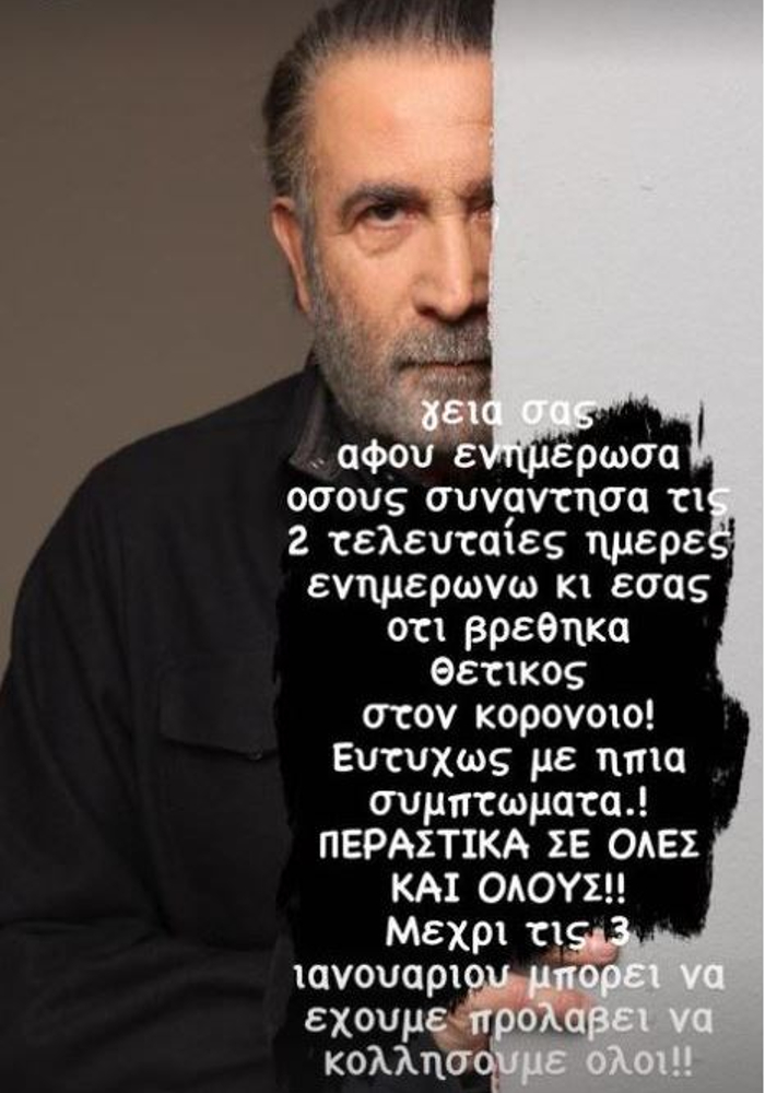 «Γεια σας. Αφού ενημέρωσα όσους συνάντησα τις δύο τελευταίες ημέρες, ενημερώνω κι εσάς ότι βρέθηκα θετικός στον κορονοϊό! Ευτυχώς με ήπια συμπτώματα! Περαστικά σε όλες και σε όλους! Μέχρι τις 3 Ιανουαρίου μπορεί να έχουμε προλάβει να κολλήσουμε όλοι!», έγραψε σε ένα story του.