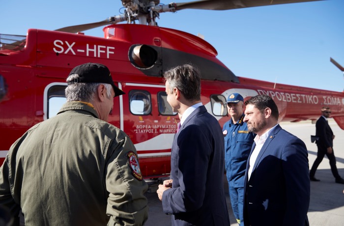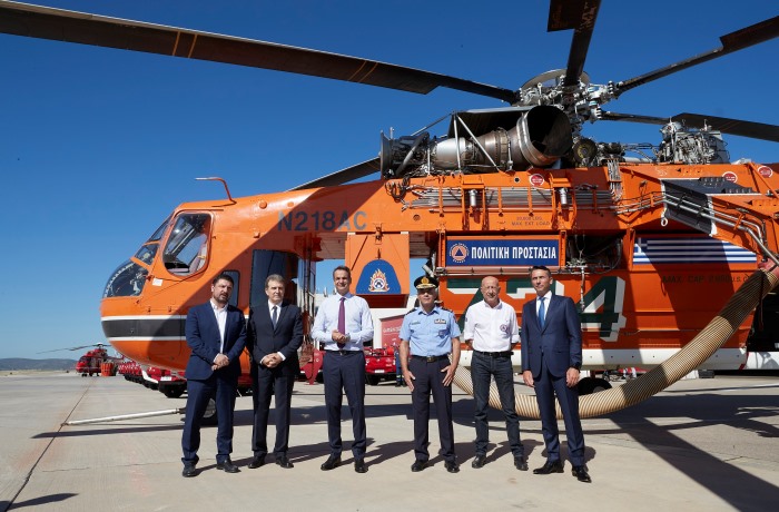 Ο Πρωθυπουργός επιθεώρησε τα οχήματα και δύο ελικόπτερα του Πυροσβεστικού Σώματος που βρίσκονταν στο αεροδρόμιο “Ελευθέριος Βενιζέλος”, και ενημερώθηκε για τις δυνατότητές τους.