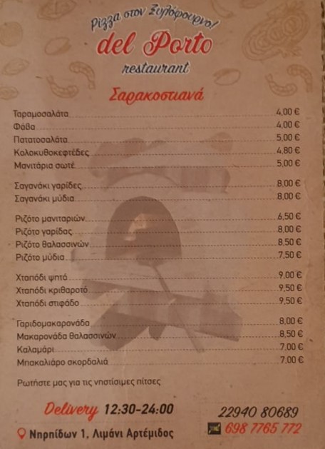 Το Pizza del Porto στην Αρτέμιδα φέρνει στην πόρτα σας, με ένα τηλεφώνημα, όλα όσα λαχταράτε! Η προετοιμασία των προϊόντων γίνεται από τους υπαλλήλους με κάθε προσοχή, με χρήση μάσκας και ειδικών γαντιών, ενώ και ο διανομέας τηρεί τα μέτρα που απαιτούνται!