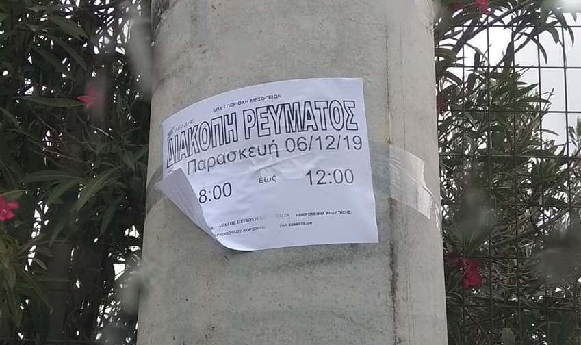 Προγραμματισμένη Διακοπή Ρεύματος θα πραγματοποιηθεί από τη ΔΕΔΔΗΕ σε περιοχές της Αρτέμιδας – Βραυρώνας την Παρασκευή 6 Δεκεμβρίου 2019.