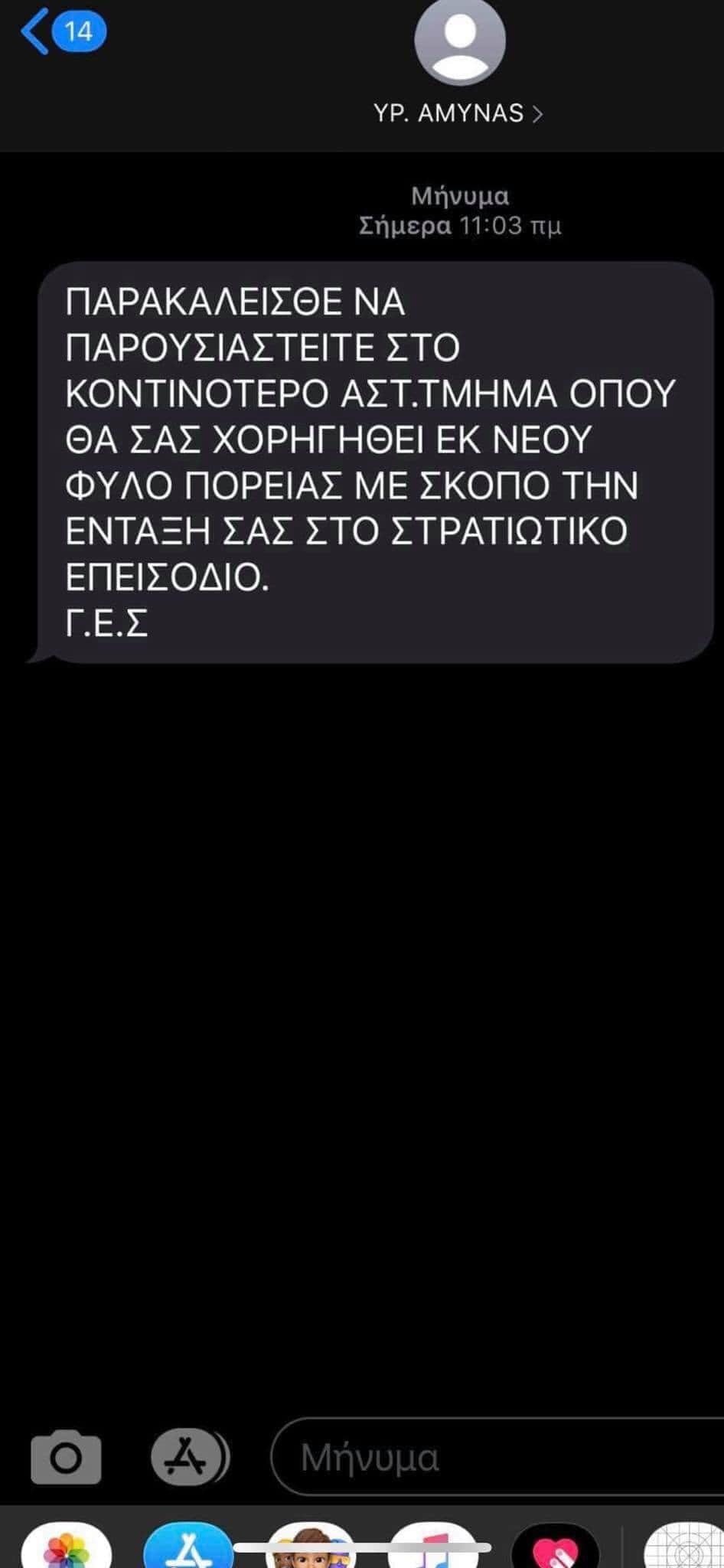 Από τη Διεύθυνση Δίωξης Ηλεκτρονικού Εγκλήματος της Ελληνικής Αστυνομίας διενεργείται έρευνα σχετικά με το παρακάτω μήνυμα (sms), που αποστέλλεται σε κινητά τηλέφωνα, καλώντας τους πολίτες να παρουσιαστούν στο κοντινότερο Αστυνομικό Τμήμα για δήθεν χορήγηση Φύλλου Πορείας από το Στρατό.