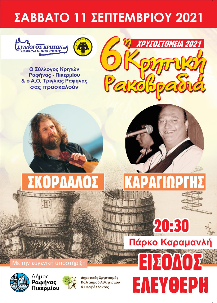 Ο Σύλλογος Κρητών Ραφήνας – Πικερμίου και ο Α.Ο. Τριγλίας Ραφήνας μας προσκαλούν στην 6η Κρητική Ρακοβραδιά που θα πραγματοποιηθεί το Σάββατο 11 Σεπτεμβρίου στις 20:30 στο Πάρκο Καραμανλή.