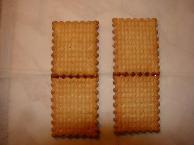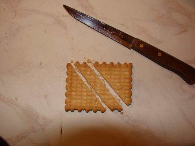 Παίρνουμε ένα μπισκότο και το κόβουμε με πριονωτό μαχαίρι, πολύ υπομονετικά, διαγώνια, για να σχηματιστούν δυο τρίγωνα και να μη σπάσουν.